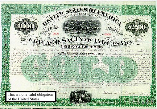 A historical bond fraud case in point involves bonds issued by the Chicago, Saginaw and Canada Railroad Co. (CS&C). It has been alleged that these securities are payable by us in gold. We neither issued these bonds, nor are they payable in gold, backed, or guaranteed by us or any other part of the United States Government. In 1873, CS&C issued 5,500 thirty-year gold-backed bearer bonds, paying seven percent interest to finance construction of a proposed railroad. Click to view a full-size image of a CS&C bond (99K JPG file, uploaded 1/24/98).
